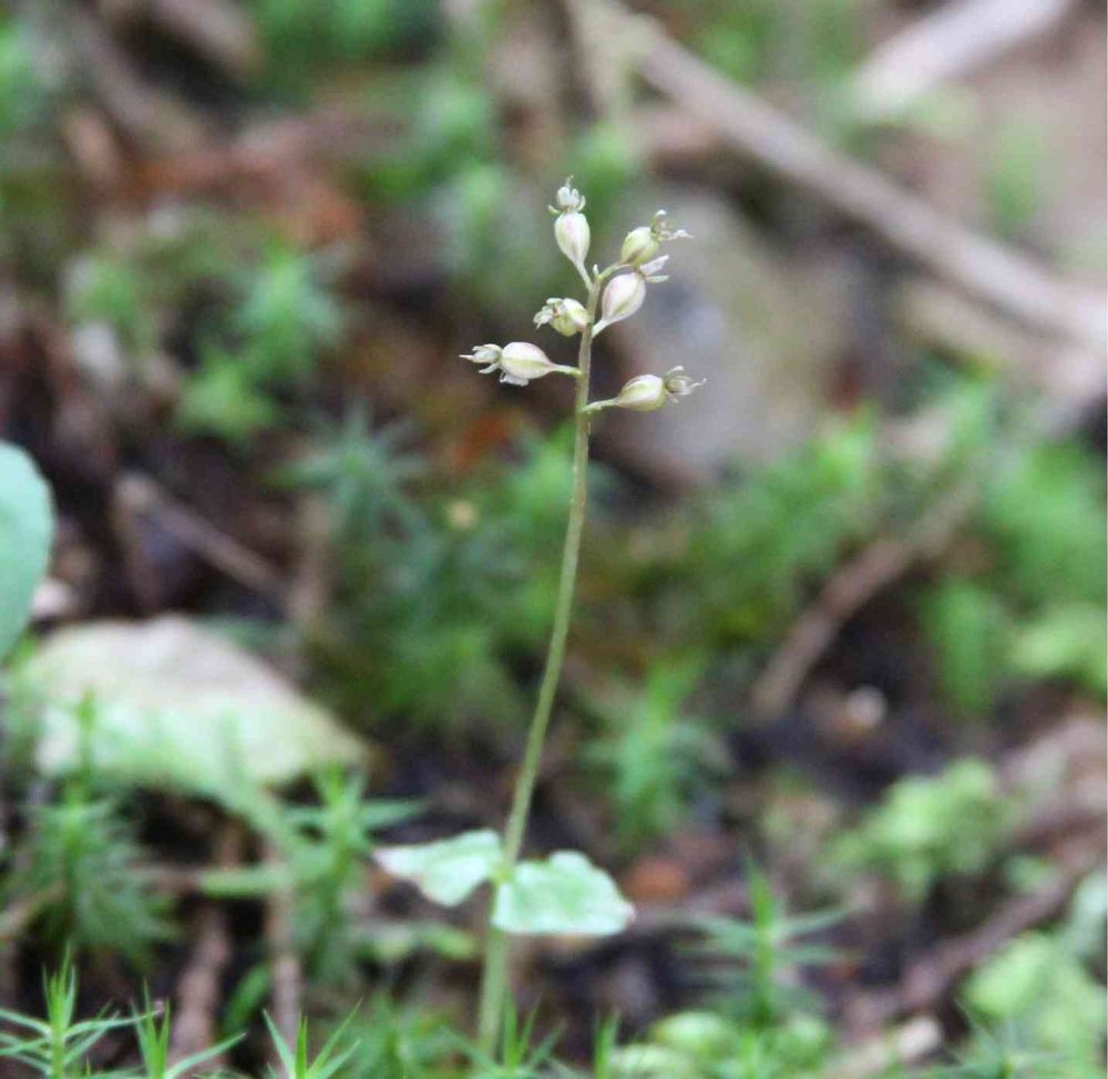 冷涼な針葉樹林の林床に咲く。1cmほどの双葉のような葉から細い茎が立ち上がり米粒ほどの子房の先に1.5~2.0mmの花が咲く。5本の緑色の筋がある。