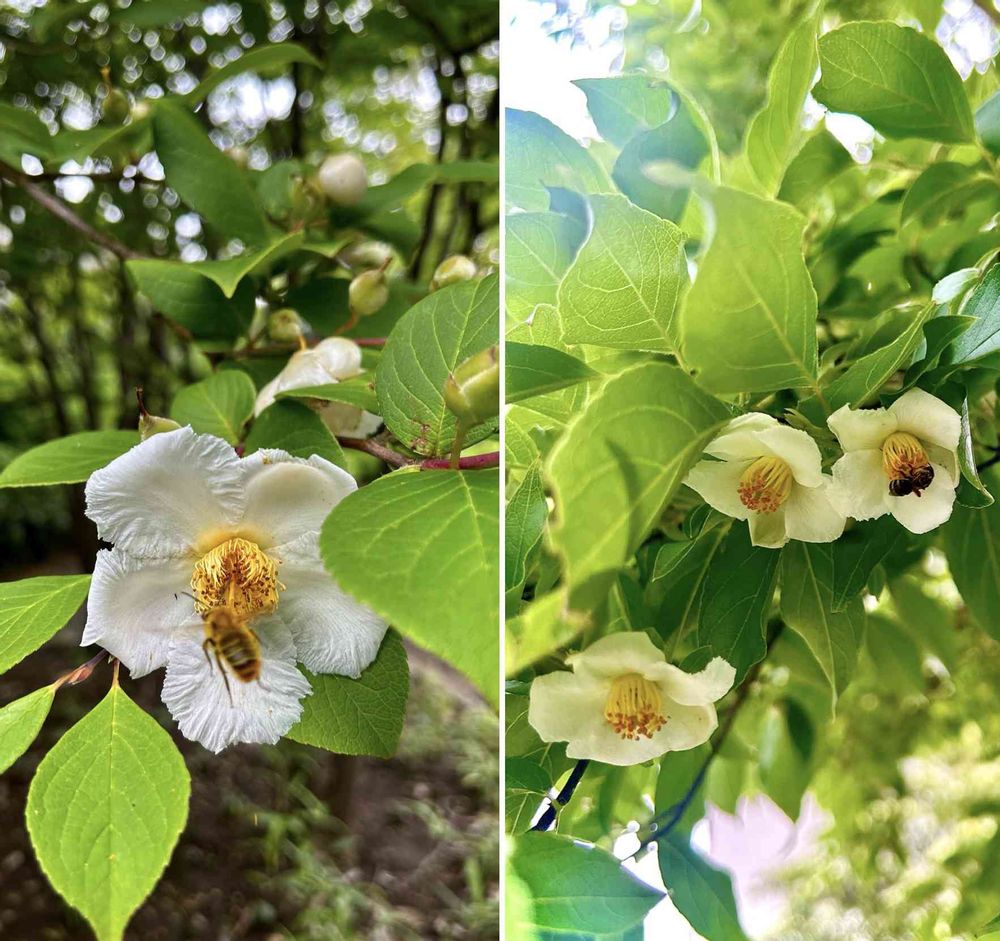 お題を意識してキョロキョロすると、武蔵野市界隈でナツツバキを植えているお宅が多いのに気が付きました。公園や小さな緑地にも。ヒメシャラの方が馴染み深かったけど、むしろナツツバキ。どちらも🐝🐝がお気に入り