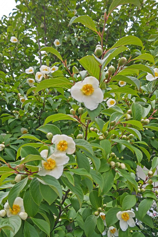 今日の花 夏ツバキ です。今年6月9日撮影です。沢山咲いて好きな花ですが、大きくなりすぎて樹下の花が育ちません。