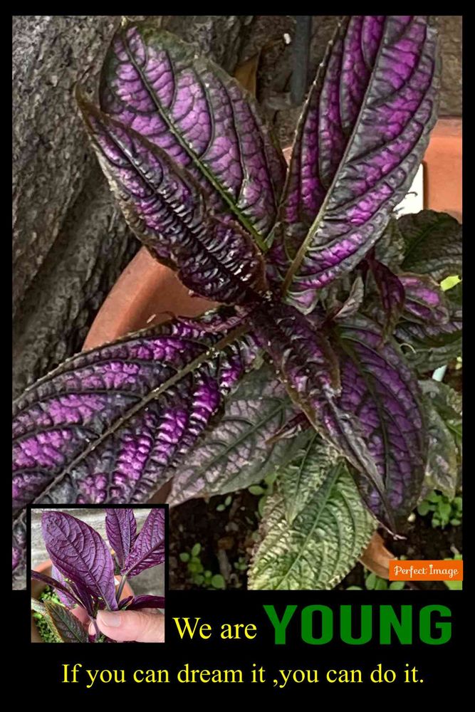 昨年水挿しから育てて、霜にあたらないように玄関で育てました。鉢に植えかえ成長しているストロビランテスです。裏をひっくり返すと紫色をしてます。ウラムラサキともいいます。