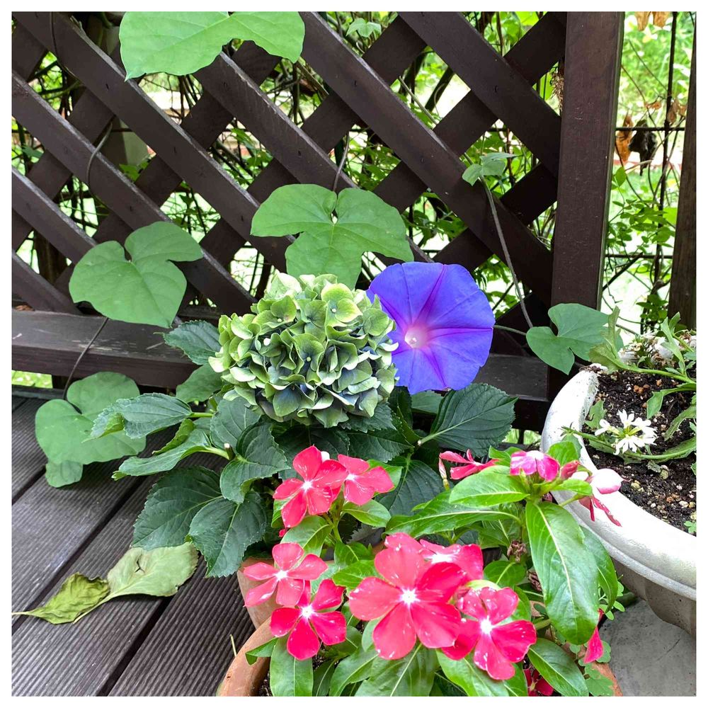今日も色が変化したアジサイに顔を出しているオーシャンブルー🫐とニチニチソウ