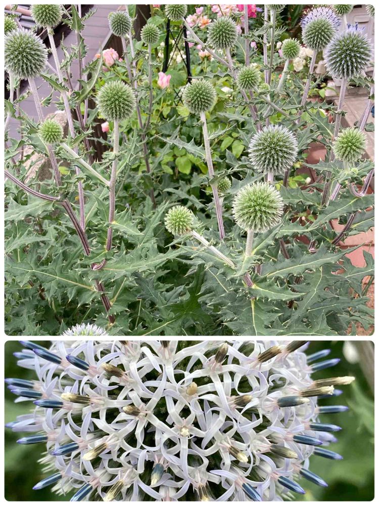 ムラサキ色のルリ玉アザミ、もう咲いてるんですね。冬に枯らしてしまって白だけ残ったんです。こちらのエキノプス?って方はトゲも痛いし野生児ですよね?