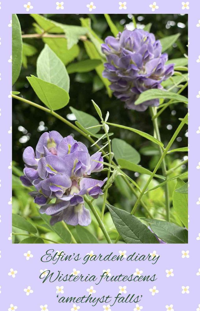 本日2枚目の投稿picは、アメリカフジ ‘’アメジストフォール‘’。前回載せた5月9日以来の今年2回目の開花です。2季咲きとは聞いていたけど、次は秋と思っていたから、花芽が着き始めた時はビックリしました。今回は花は少し小さめで軽いのか上向きで咲いていますが、花は15個も着いていました。