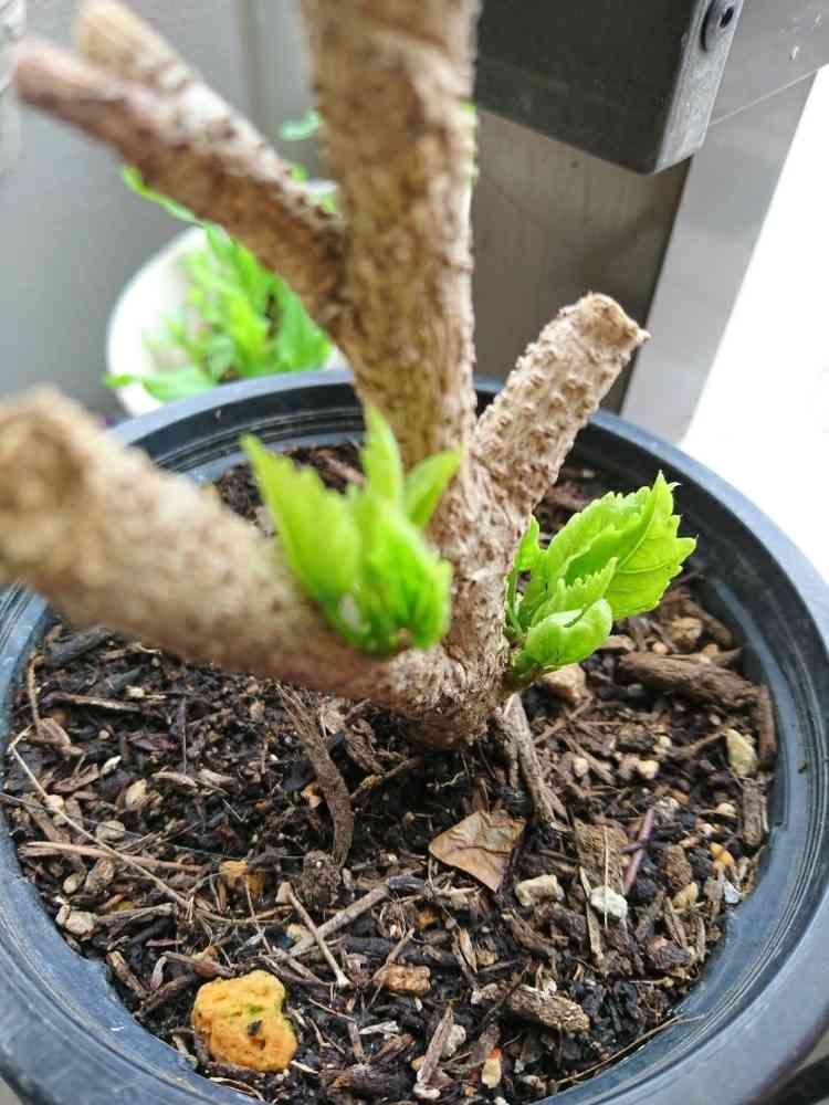昨年夫が自分で父の日プレゼントとして買ってきたハイビスカスです。管理をおまかせしていたら見事冬にやられてしまいました。ダメ元で、上の部分をすっかり落とし根元から復活してくれないかなと見守りました。4月の終わりごろからなん緑っぽいものが見えていたのでひょっとしたらと思って期待してました。このようにちゃんとした葉っぱを見せてくれました。今年はダメでも来年には花を咲かせてくれるのではと思っています。ワクワク😃💕