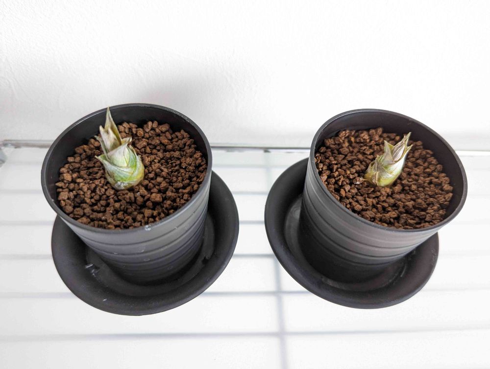 頂いたパイナップルに子株が付いていたので試しに植えてみました。根が出るかお試しです。本体は美味しく頂きました。