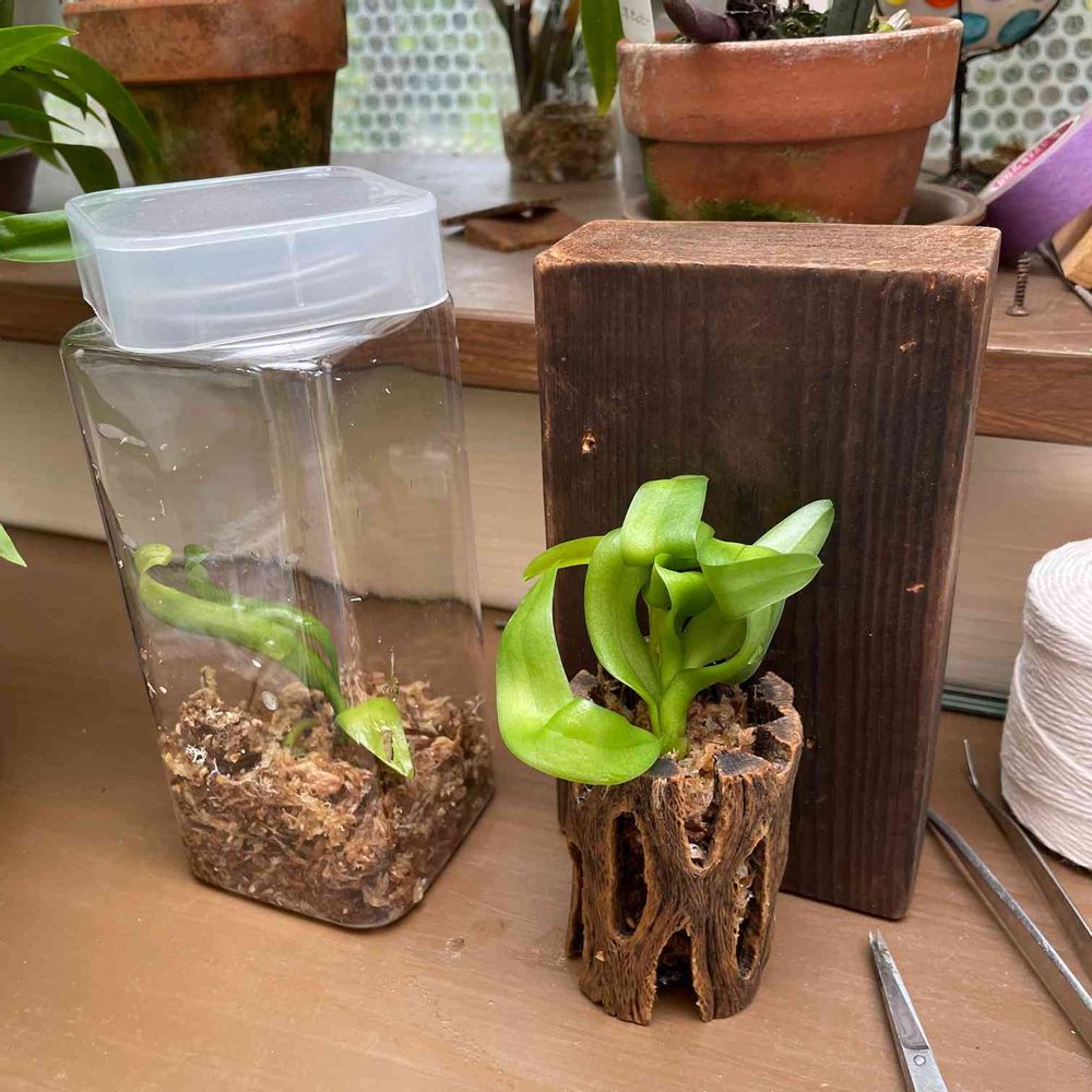 ひと株はバーナーで炙った木材にカクタスボーンを付けて水苔で🪴