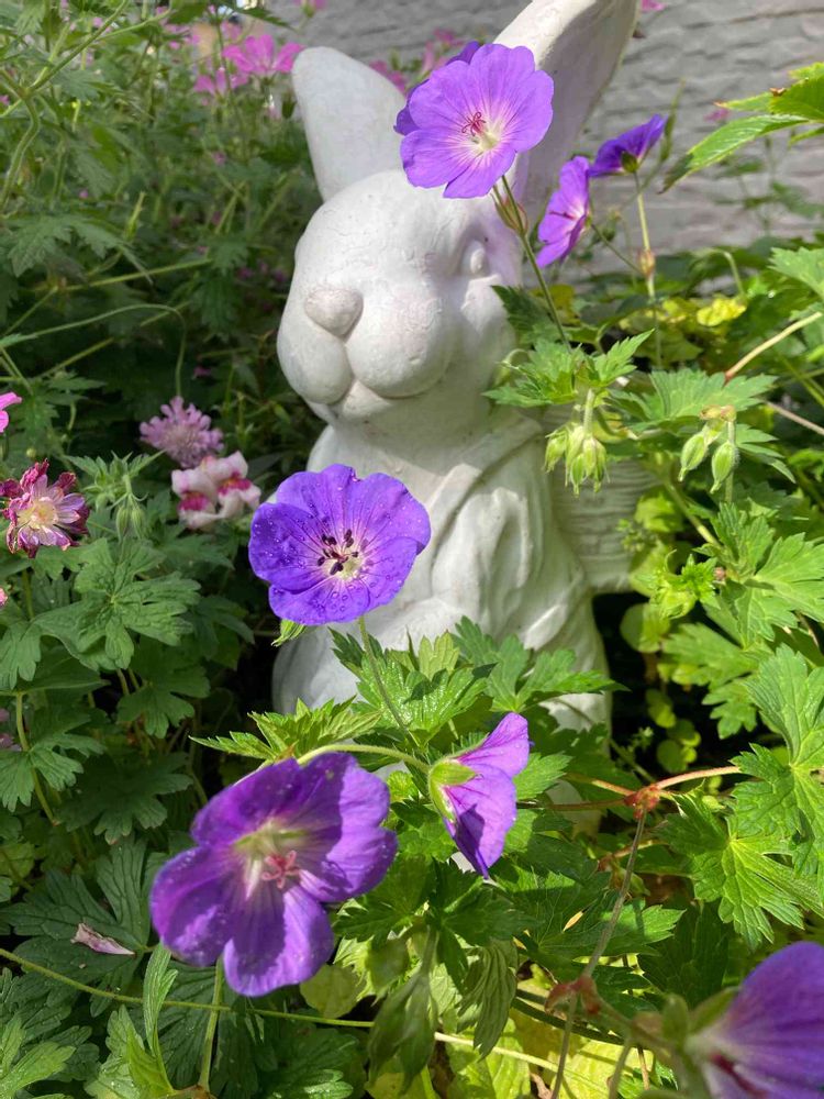 うさぎの周りにゲラニウム ロザンネイが増えてきました🌸お花ばかりでものっぺりになるし、フォーカルポイントというのはおこがましい小さな裏庭ですが、なんかポイントあるといいんですね🥰恵庭で衝動買いした、うさぎさんは正解だったと思いました💕