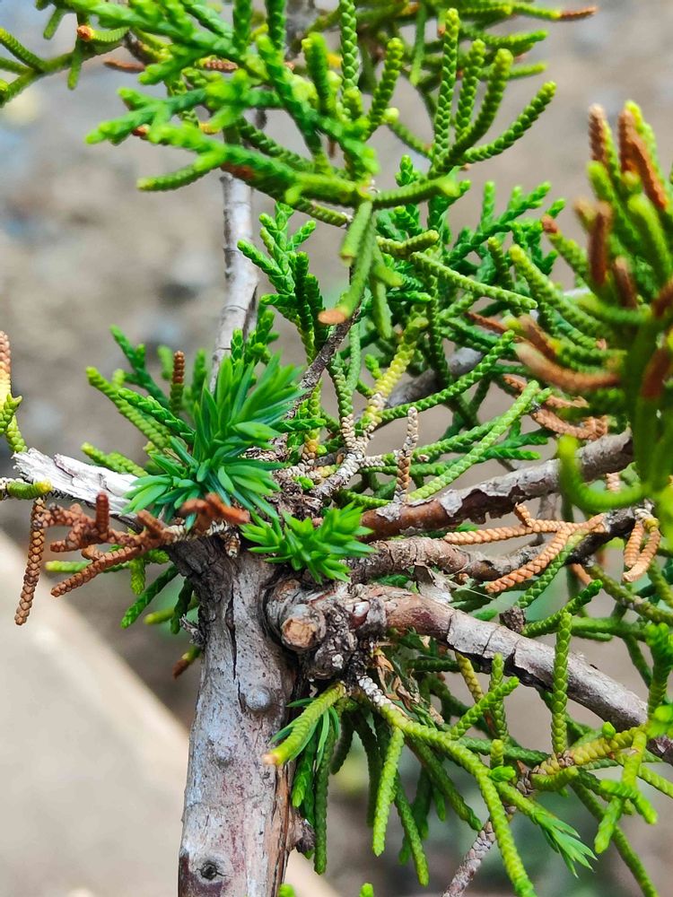 盆栽ではジンのしっかりしたもの等が糸魚川シンパクと呼ばれ松の次に人気が有りますが仲間のカイヅカイブキの様に杉葉(杉っぱ)と呼ばれる先祖返りが出る事がありますね〜この枝変わりは元から切ると又出てくるので少し残して切る事が秘訣デス