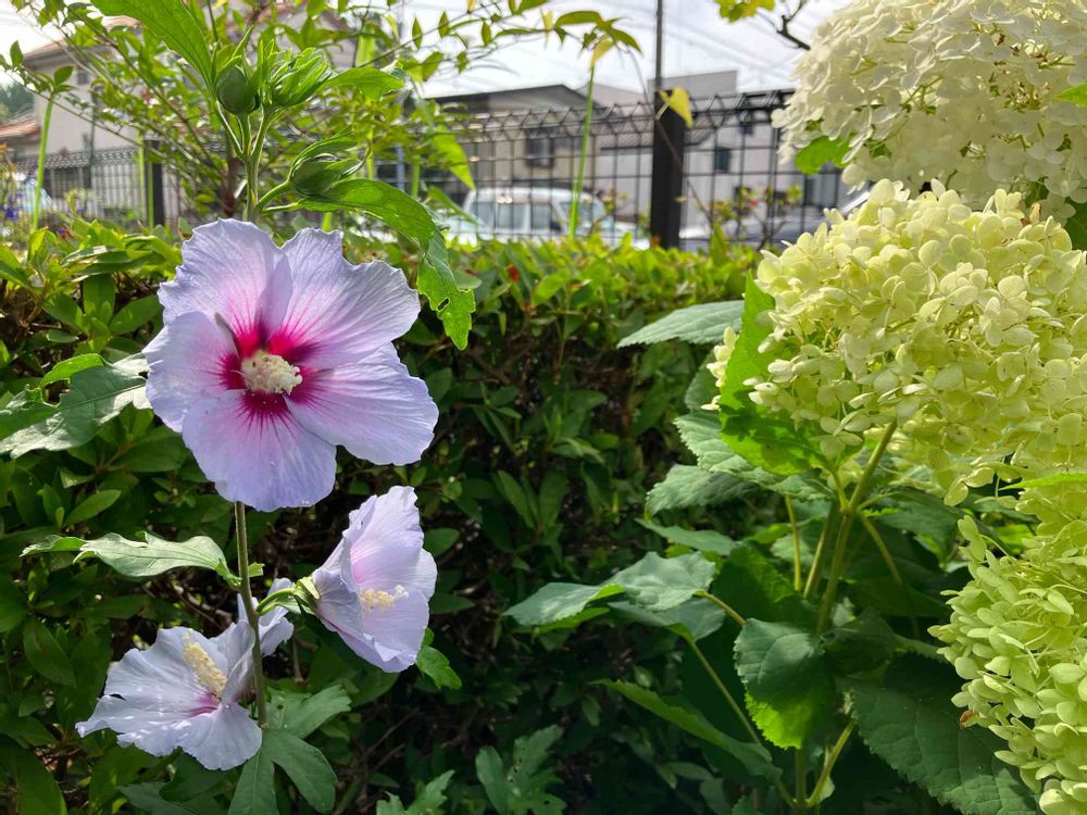 アナベルさんの隣で薄紫色のムクゲさんも咲き出しています💜╰(*´︶`*)♡