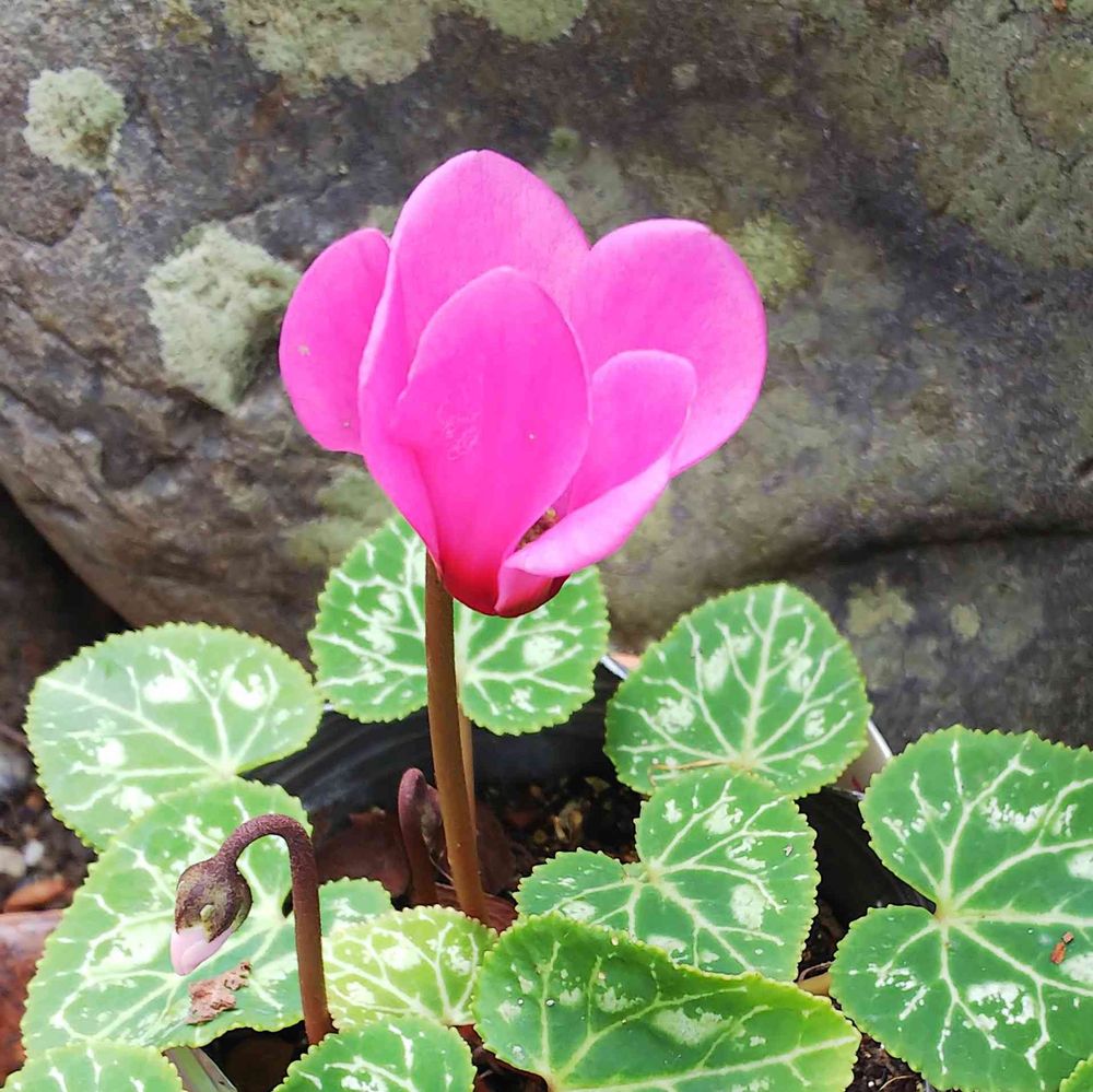 ずっと庭に植え替えされることもなく岩の陰で放置されてるなぁと思ってたんです。でも、葉っぱ元気だなぁと。そしたら、花も咲かせててびっくりでした😲シクラメン、案外タフ😁