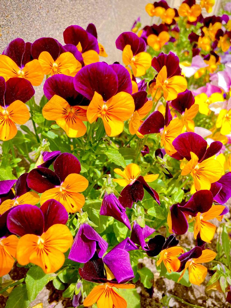 我が家の花壇で今、1番アピール力の強いパンジーさん達🌼🧡💜陽射しを浴びてキラキラしてる✨✨眩しいくらい輝いていてちょっぴり羨ましい…いいなぁ😌♡