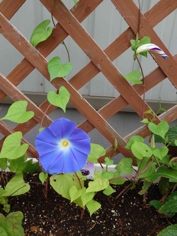 我が家で初咲きヘブンリーブルー、と思いきや、右上に咲き終わってつぼんでいる子もいました😓