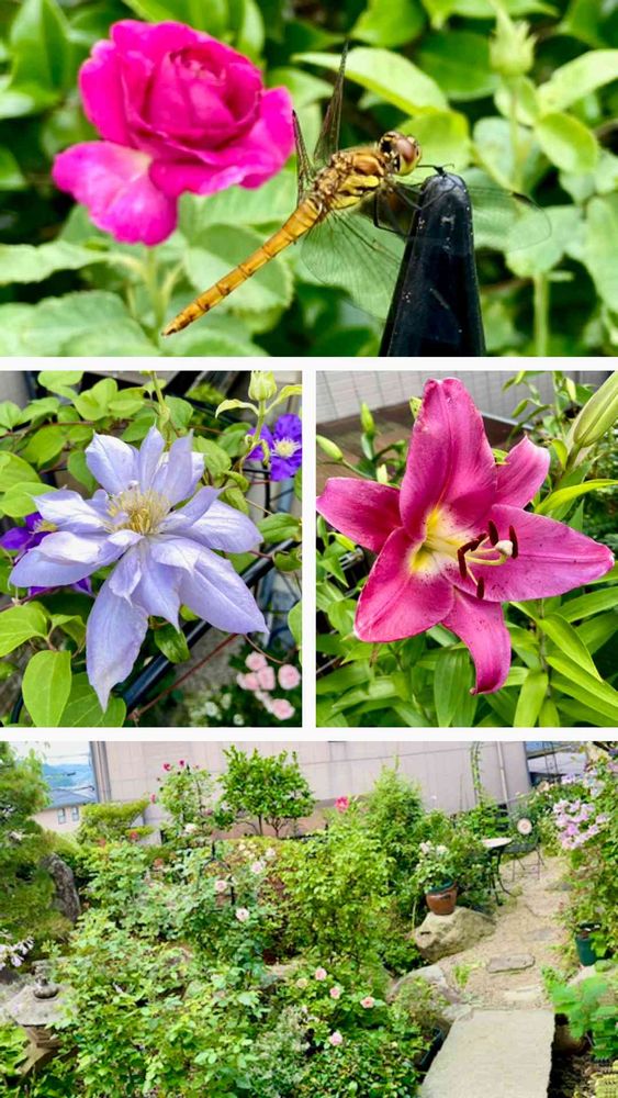 ☔️蒸し蒸しの今日の庭🌧️庭パトしてたら🌹オベリスクの先にムギワラトンボが止まった🎵😻アーチの天辺にクレマチス🥰カサブランカピンクも咲き出したよ❣️