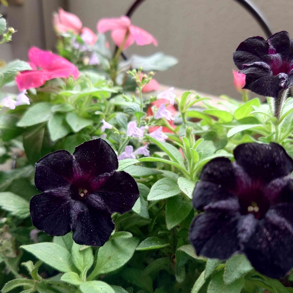 ペチュニア黒之瀬戸、少し前に切り戻してバスケットに植え替えたら、みょうにはりきってさいています😃