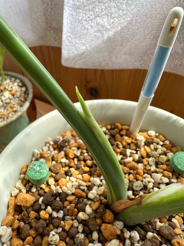 うちにお迎えして2ヶ月ちょいのモンステラ。全然新芽が出なかったけどようやく!昨日ふくらんできててついに…と思ってたら一晩でこんなに伸びてた!