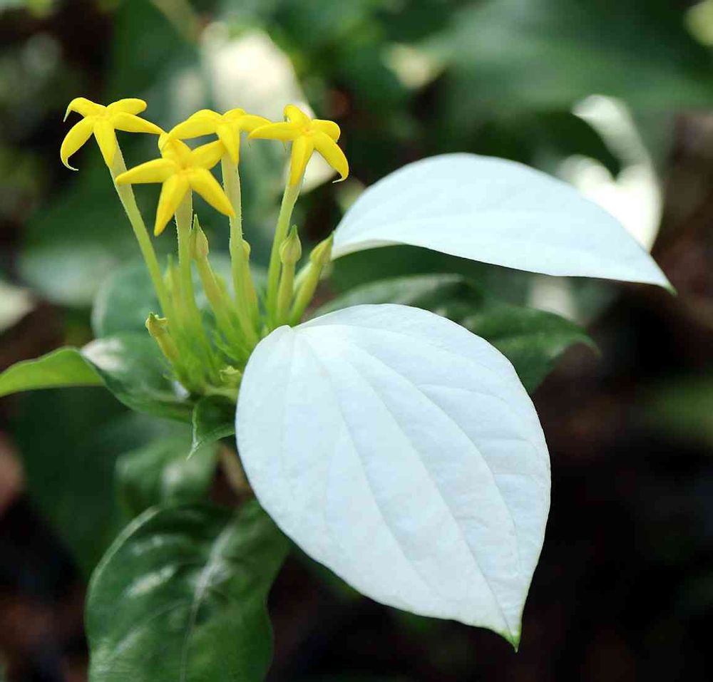 白い花のような苞に黄色の星型の花が美しい半つる性の熱帯植物。