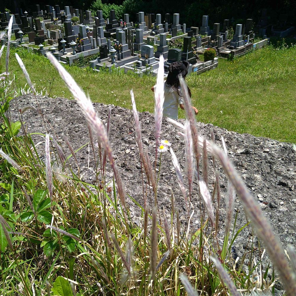 お墓に供えたお花にチガヤを持って走って来ました。