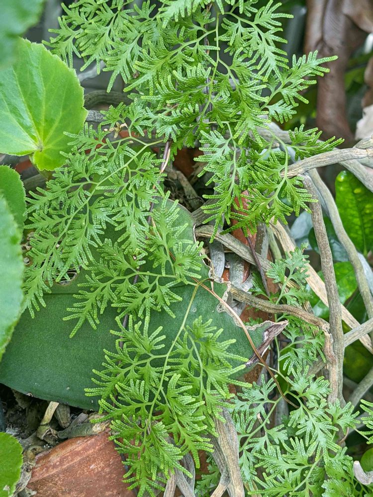 胡蝶蘭の鉢にベコニアᒼᑋªⁿ♥︎の種が飛んで居ますけど、シダっぽいツル性の子🌱も…σ(∵`)?いったいなんだろう❓可愛かったのでpic✨しました❣️