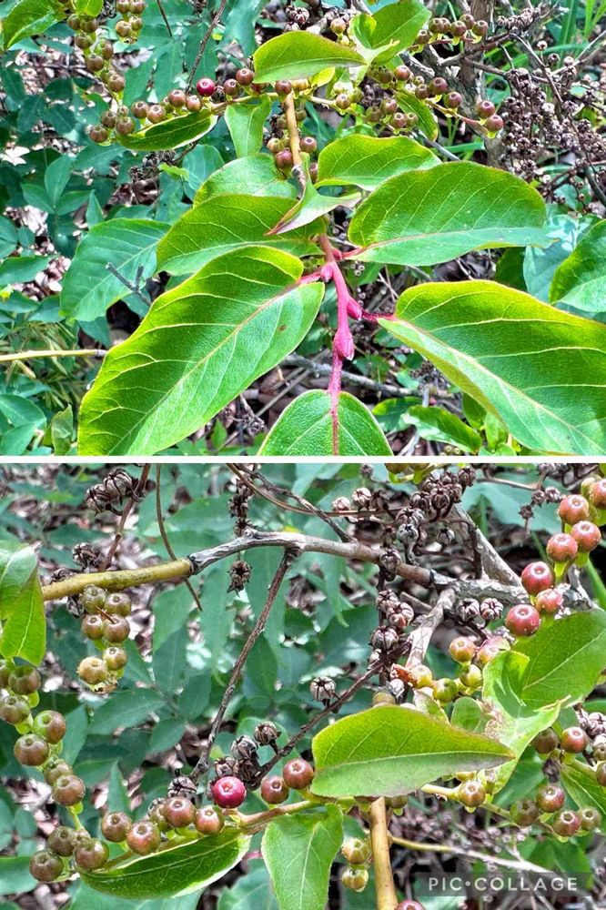 1cmにも満たない天辺に凹みのある小さな果実を、上向きに(花は下向きにぶら下がります)鈴なりにつけているこの樹木🌳