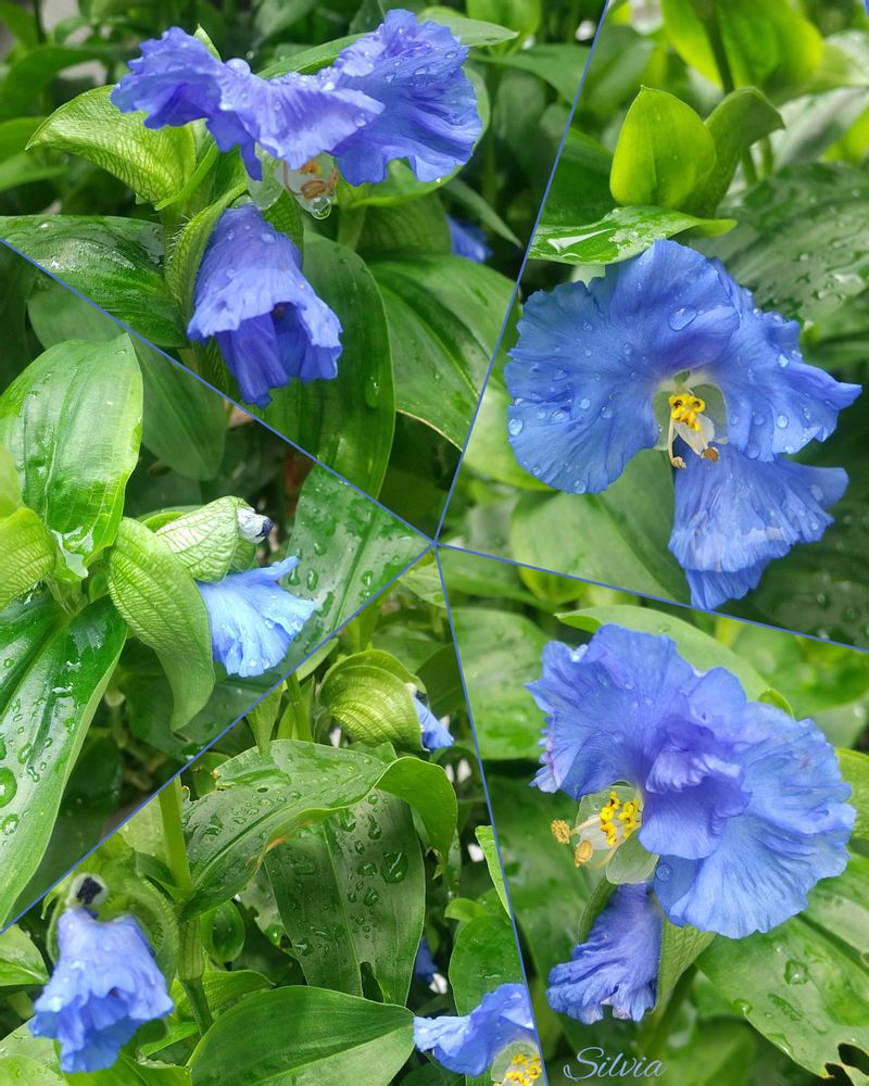 ♣️名前は帽子花だが、ツユクサの仲間。ツユクサ より花がずっと大きく4~5cmもある。中国原産で江戸時には日本でも栽培が始まる。ツユクサの仲間のムラサキツユクサ 、オオムラサキツユクサ 、アカバナツユクサ は花びらが3枚だが、ツユクサやこのオオボウシバナは2枚。花は一つの茎に2輪づつ付ける。アオバナの青色色素はアントシアニン系化合物であり、水溶性で色落ちしやすいという特徴があるため、下絵を描くときの顔料として染織工芸の分野、特に京友禅で用いられた。♣️