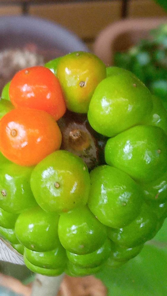 軒下のテンナンショウ達のなかで 唯一実をつけたマムシグサ 熟れ始めました🤗