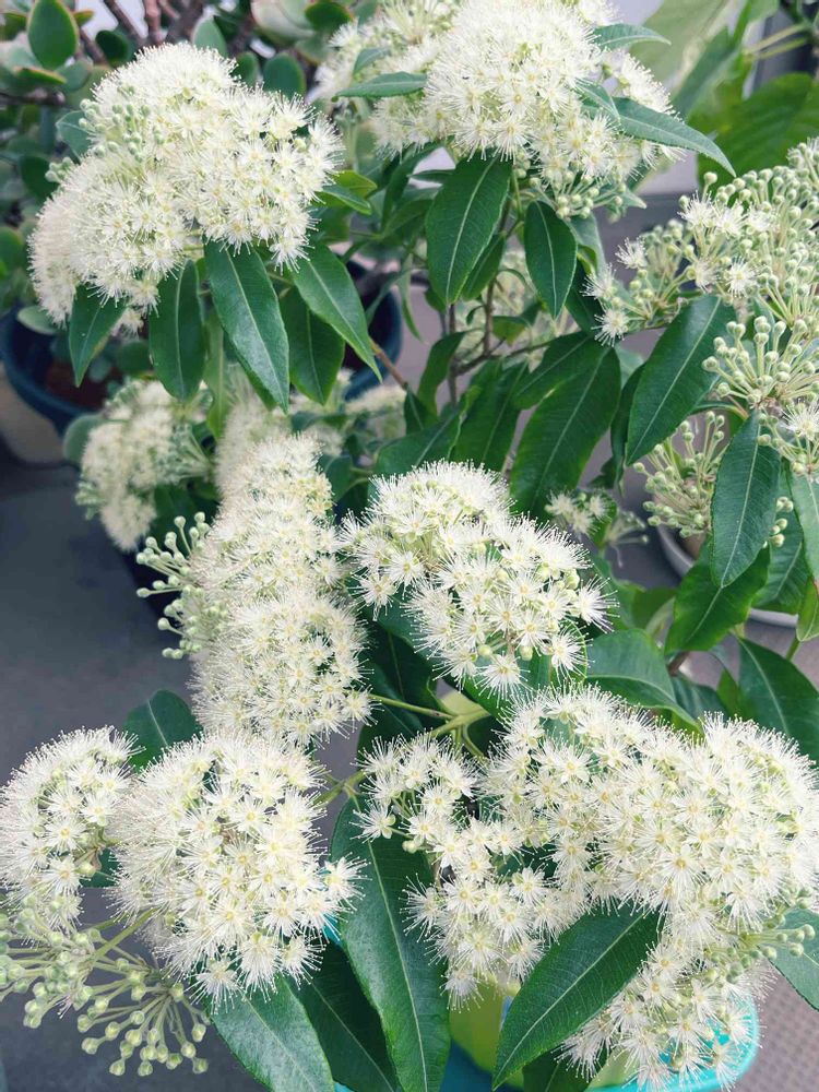 お気に入りのレモンマートルがモリモリ咲いてます。主役は爽やかな香りの葉っぱだけど、毎年お花も咲きます。