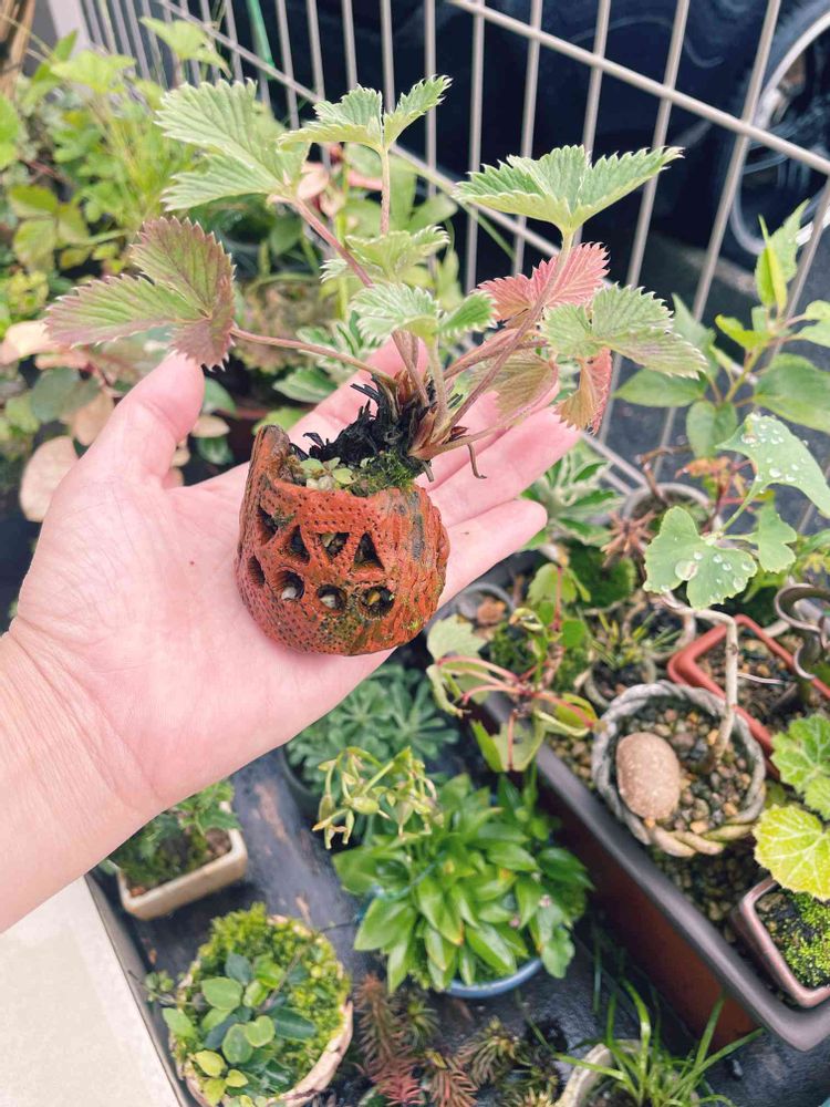 エアプランツを入れていた鉢と同じシリーズこちらは野いちご植えてあります、意外と背中に穴空いてても平気みたいです