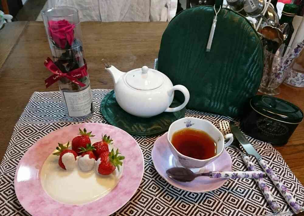 家庭菜園で採れたイチゴでティータイム。採れたてのイチゴ、あまーい!