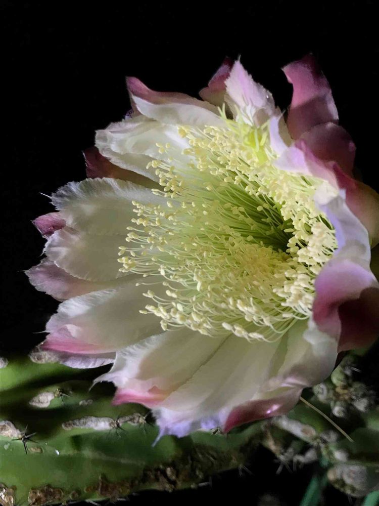 昨年の台風?でバキッと根元近くが折れて、横倒しになっていた柱サボテン🛏が、先程午後7時半位に開花しました。撮影は闇が深まった午後8時🕗🤳