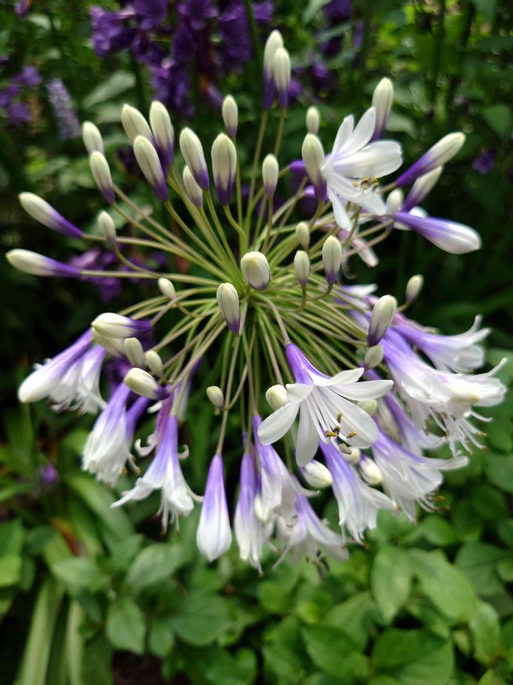 紫と白のアガパンサス・ファイアーワークスの花、バイカラーで花火のように綺麗です💜🤍🌿