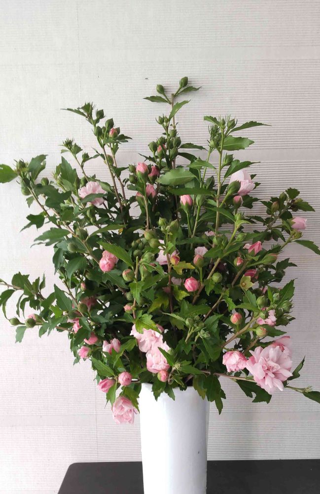 先日裏庭で剪定したムクゲのお花を真っ白な花瓶に…。