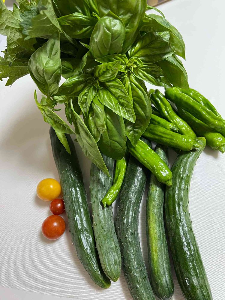 きゅうり、ししとう、ミニトマト、バジル🌿夏野菜がとれはじめましました。