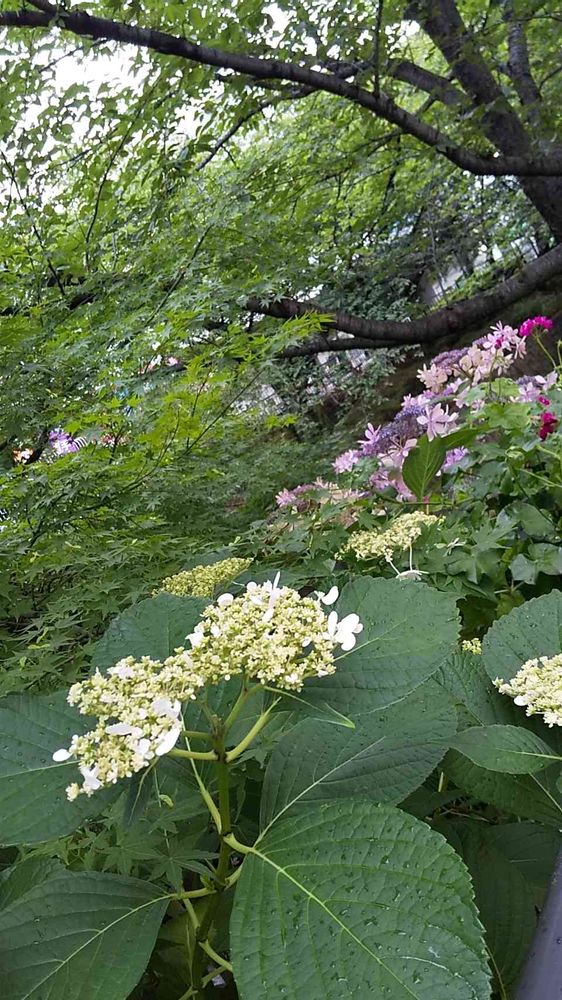 新緑イロハモミジの下には…ガクアジサイ色とりどりに…