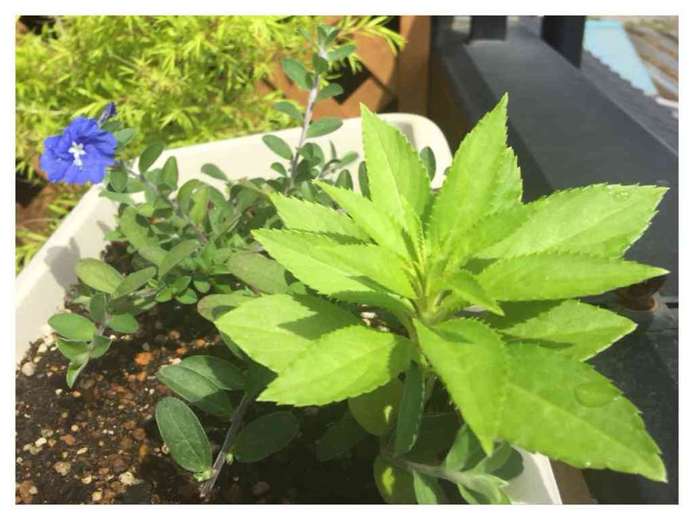 アメリカンブルーのプランターに去年見たような?葉っぱが。