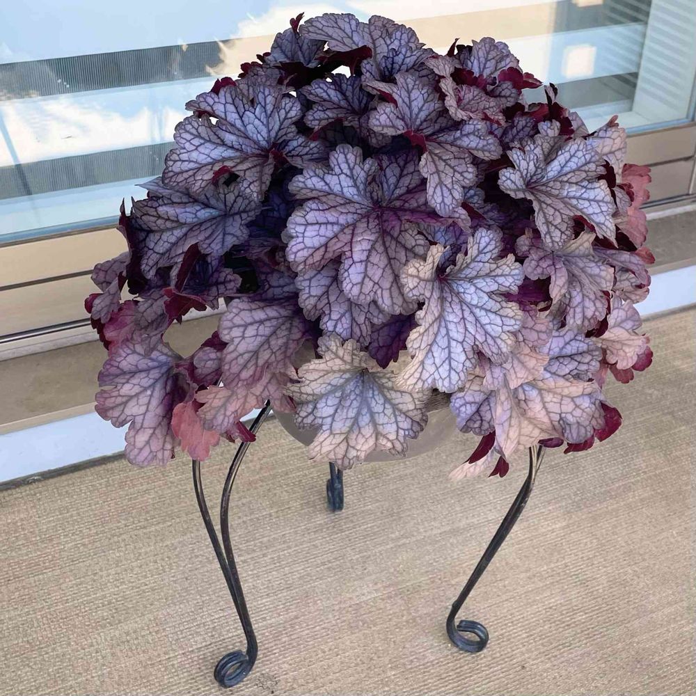 数年前に1ポット購入し、他のヒューケラと寄せ植えして育ててきましたが、他のヒューケラに群を抜いて茂ってきた為、去年から単独で育てています。25㎝プランターが見えなくなる程こんもり茂り、まんまるの可愛らしい姿になりました。