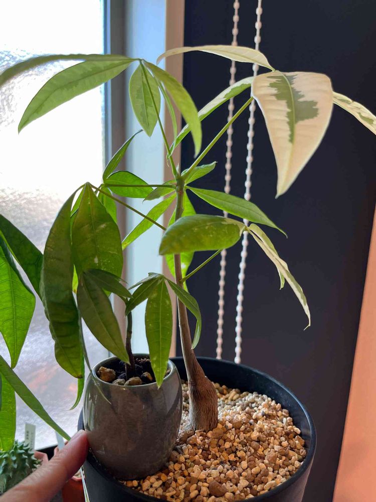 同じ日に生まれたのに、ひとりだめっちゃ小さいパキラちゃんと、ひとりだけ斑入りになったパキラちゃん。