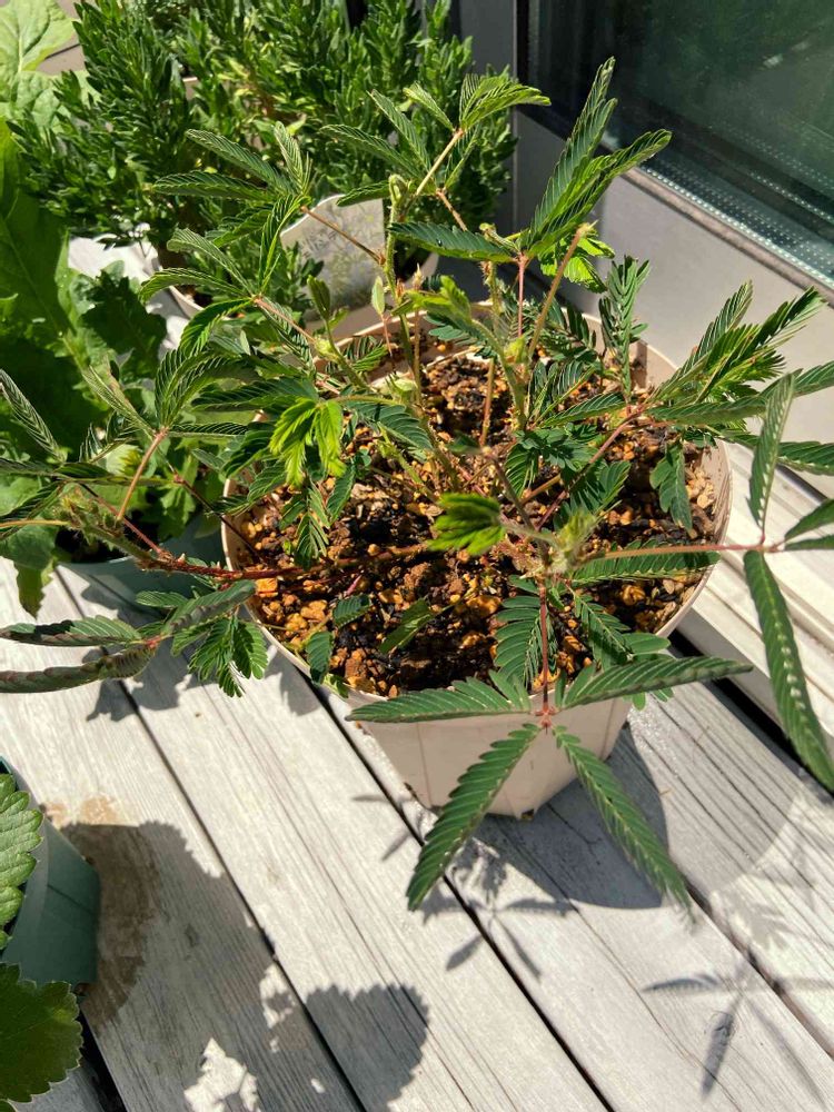 おじぎそう。5月の終わり頃に買ってきて100均スリット鉢(たぶん3号位のやつ)に植えて暫くしてから鉢底から根が出てきたので4号のスリット鉢に植え替え、今回も鉢底から根がわしゃーっと出てきてたので今回は6号ロング鉢に植え替えました。おじぎそうってこんなに成長早いんだ!(◎_◎;)
