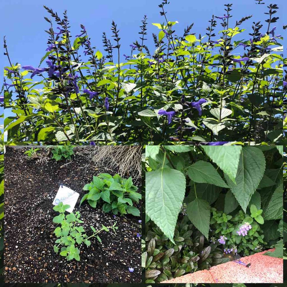この場所はブルー系の花で埋めつくそうと思って4月始めに購入したネペタキャッツパジャマとアジュガとベロニカオックスフォードブルーを新たに植えましたが、スーパーサルビアの成長が凄すぎて全てを覆い尽くしてます😓💦 株幅150cmくらいになっちゃいました😅