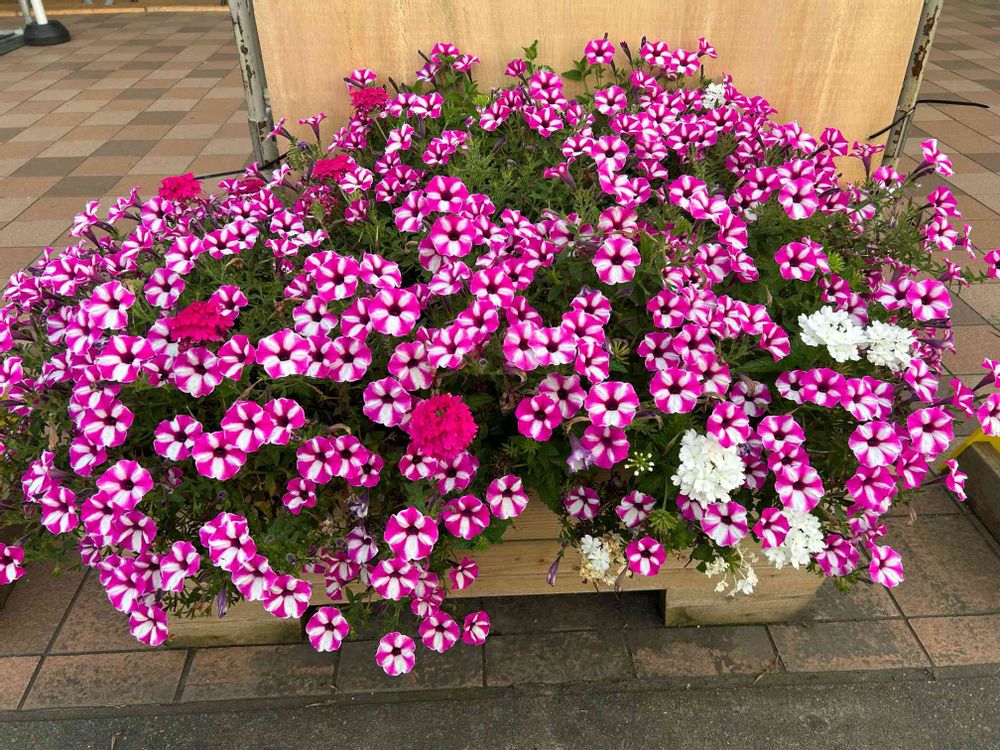 PW×CAINZコラボのあふれ咲きペチュニア ラズベリージャムにスーパーベナのホワイトとローズが合わされたコンビネーション苗を植え込みました🪴