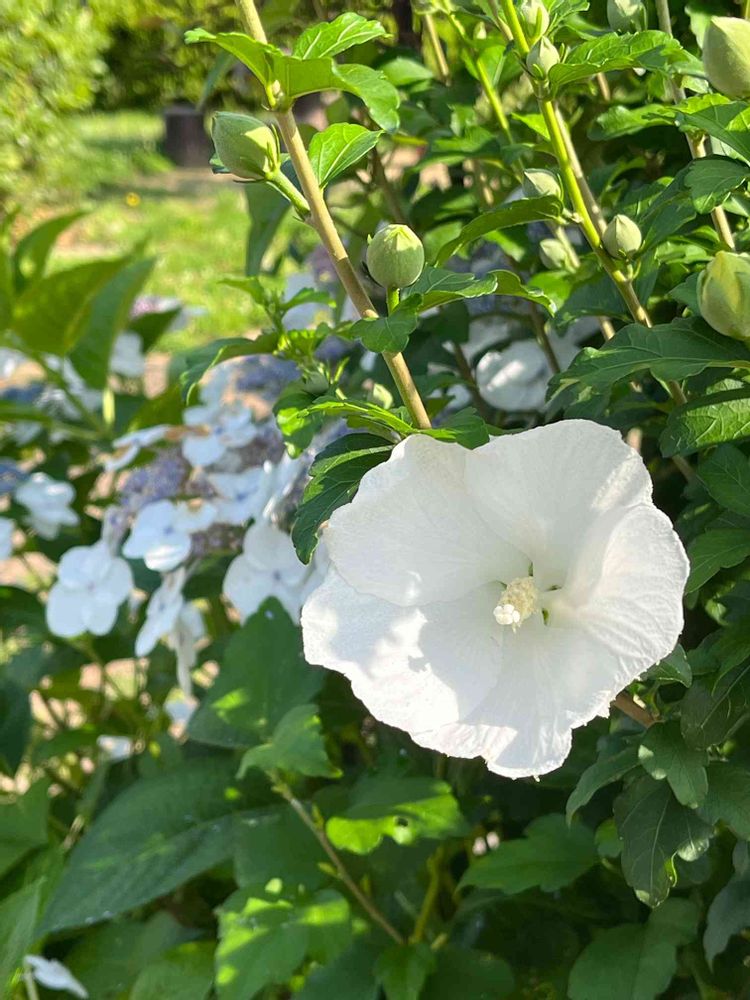 近所の公園で真っ白なムクゲの花が咲いています😄