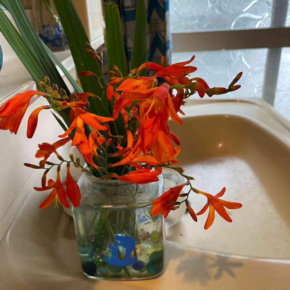 強い雨風の中、今年はこのお花が咲きました。雑草なのであちこちのを抜いてましたが、、。🧡倒れそうだったので飾りました。✴️✳️✨✨モントブレチア、、
