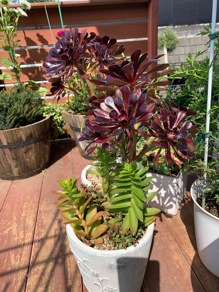 下の子は寄せ植えで多肉植物の火祭りさんです。お花咲かないんじゃないかな〜。黒法師さんがすでにお花みたいで。