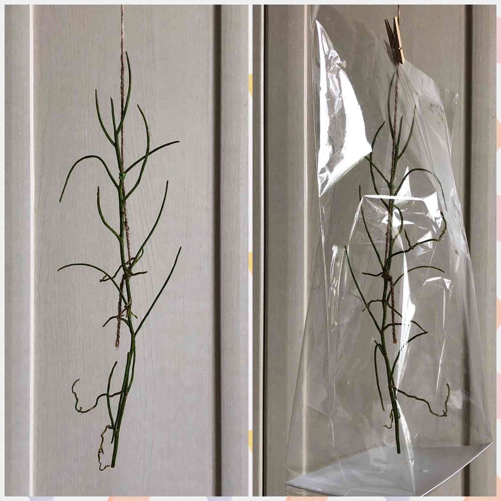 腐敗した部分を切除してぶら下げ、毎朝霧吹きし、ビニールで覆って養生中。