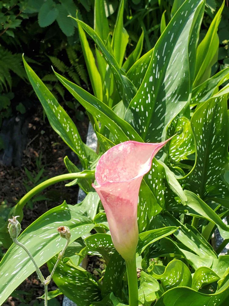 カラーを集めたコンテナから今度は斑模様の桃色が咲きました💕
