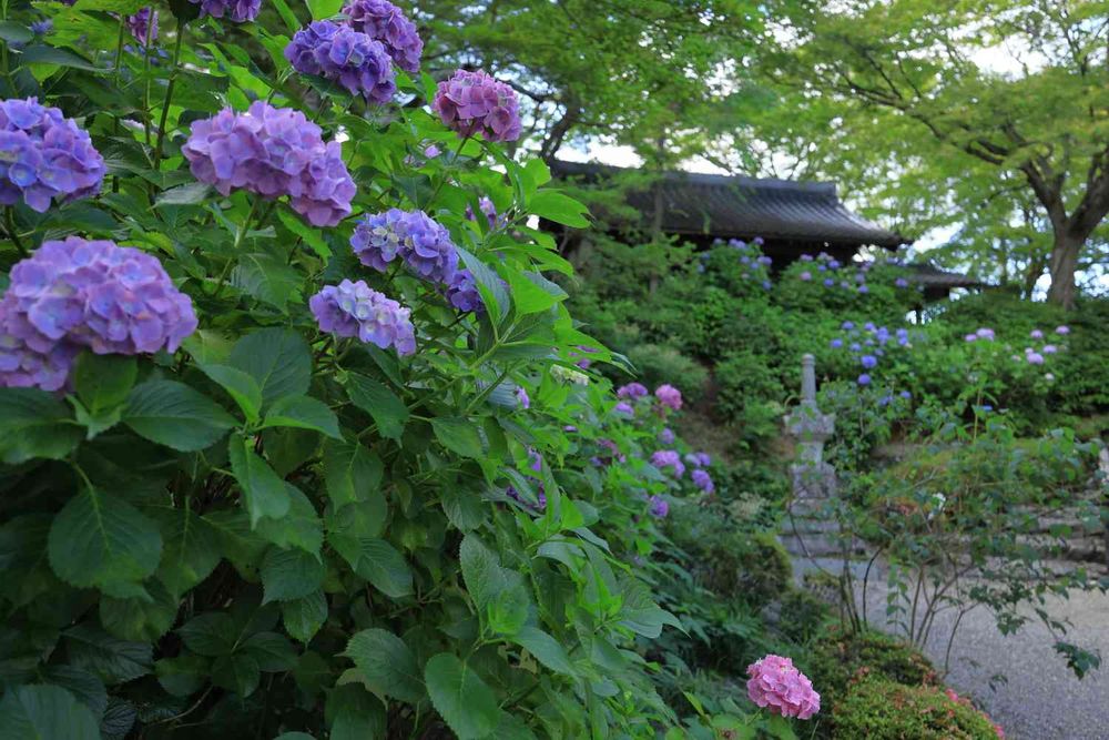 京都西山三山(先日紹介した柳谷観音楊谷寺、光明寺)の一つ。境内は3万坪の広さを誇り、その中に三千坪の白山あじさい苑があり、セイヨウアジサイ、ガクアジサイ、ヤマアジサイなど約八千株の紫陽花が斜面一面を華やかに彩ります。