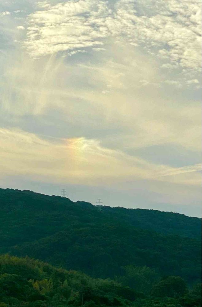 帰り道、山の上にほんの一部分だけ虹の3色くらいの光が見えました。