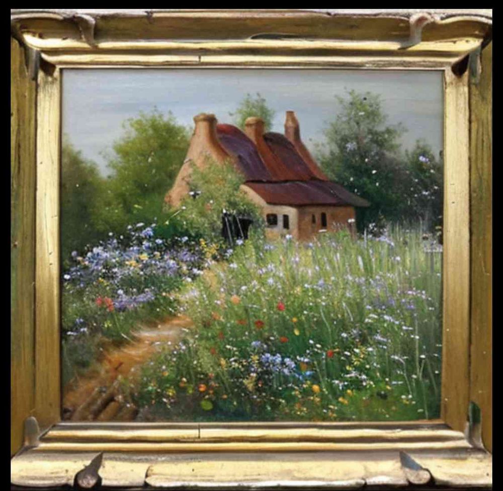 10K,高品質,写実的,油絵, アンナ・ピーターズ, 向こうにコテージがある銀行の野生の花,花の風景画,木製額付きで絵の全体を描く
