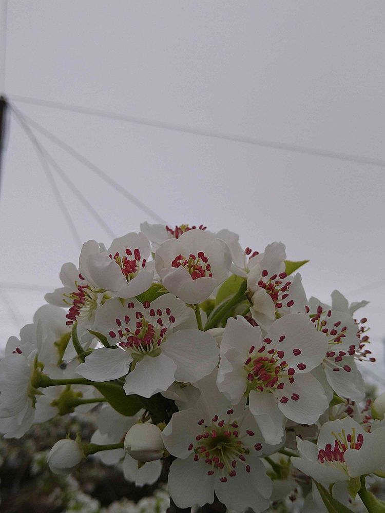 この品種の蕊がいちばん赤いかも(わが家の梨の花の中では😊)