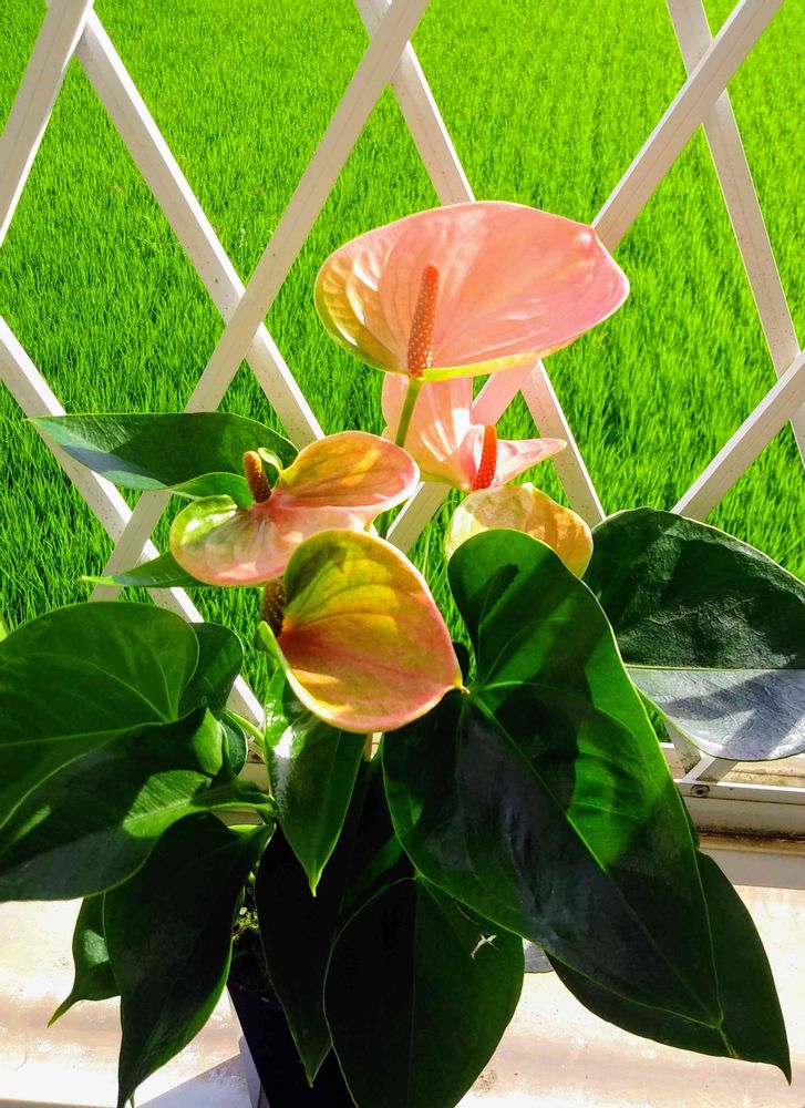 綺麗な薄桃色のアンスリウムですね。バックの田園も稲の丈が伸びて、夏の色になっていますね。
