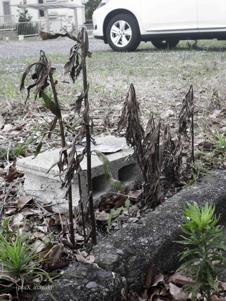 自宅から駅までの道すがらの光景。除草剤の跡と思われます。いかなる植物も歓迎されない場所。鉄道の線路の中と駐車場。かわいそうですが,仕方がないのか。テデヌークとか,カマデカールの使用にとどめて欲しい気持ちもあります。